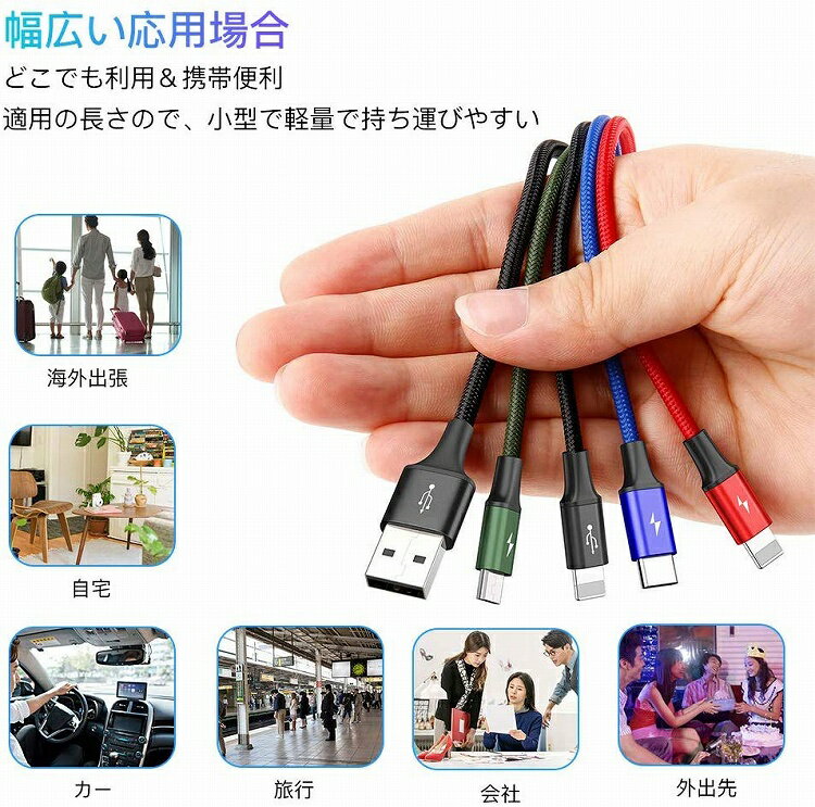 驚きの4in1充電ケーブル このケーブルはMicro USB、Lightning、Type-Cが一つになった便利な設計の一本四役の4in1充電ケーブルです。