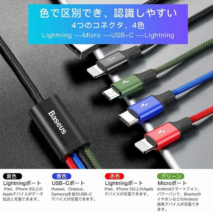 名称 Baseus iphone Type-C Micro USB 4in1 充電ケーブル 1.2m CA1T4-A01 ライトニングケーブル ケーブル長さ 1.2M 対応機種 Lightning端子:iPad、iPhone 5以上のAppleデバイス USB Type-C端子:Macbook、Huawei、Oneplus、Samsungなど Micro USB端子:Androidスマートフォン、パワーバンク、Bluetoothイヤホンなど ご注意 商品のお色は撮影時の環境、ディスプレイの発色などにより実物と多少の違いが生じることがございます。