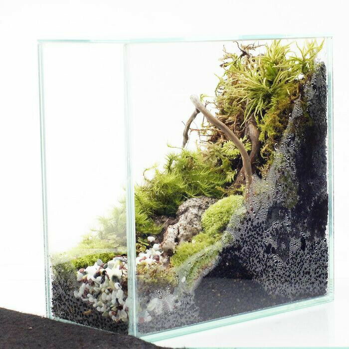 【完成品 現物】奥行き感のある 苔テラリウム ガラス水槽 流木 蓋付きで手入れも要らない 本棚にも置けるインテリアを選ばない苔テラリウム 他の水槽では出来ない奥行き感のあるレイアウトが出来るGEXのグラステリアFITを使いレイアウトした苔テラリウムの完成品です。