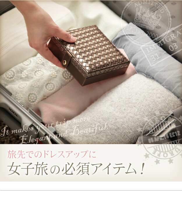 【カラーバリエーション】 ブラウン・ホワイト 【仕様】 本体(外貼り):合成皮革(PU) 蓋部分:合成皮革(PVC) 内貼り:ポリエステル100%(スエード調) 【サイズ】 外寸:幅12.5x奥行12.8x高さ4.2cm 重量:約0.2kg フリースペース:幅11.5x奥行5.3x高さ1.9cm リング挿し:幅11.8x奥行1.4x高さ1.9cm(x4本) フタ裏ポケット:幅10.5x高さ4.8cm(フックx3本) ピアスホルダー:幅11.2x奥行5.2cm(穴8つ) 株式会社ナカムラ(12700007)ジュエリーケース 携帯用 持ち運び イントレチャート調ジュエリーボックス 〔アンジェラ〕 ミニ アクセサリーケース アクセサリーボックス ジュエリー収納 小物入れ リング ピアス イヤリング ネックレス コンパクト【注意事項】こちらのページの商品は、メーカー直送の商品となります。