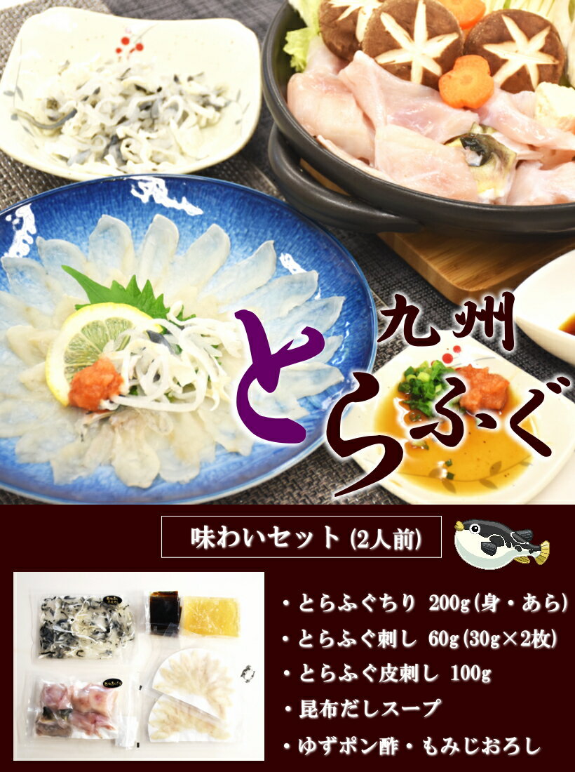 商品説明 商品内容 とらふぐ味わいセット 2人前 容量 ふぐちり(身・あら) 200g ふぐ刺し 30gx2枚 皮刺し 100g昆布だしスープ・ポン酢・もみじおろし付 送料 送料無料 ※沖縄・一部離島は別途送料1,100円かかります 配送方法 クロネコヤマト/クール便(冷凍) 保存方法 冷凍庫(-18℃以下)で保存して下さい 賞味期限 ご家庭の冷凍庫では、温度変化が激しい為ご購入後のご家庭用冷 凍庫での保存は1か月を推奨しています。