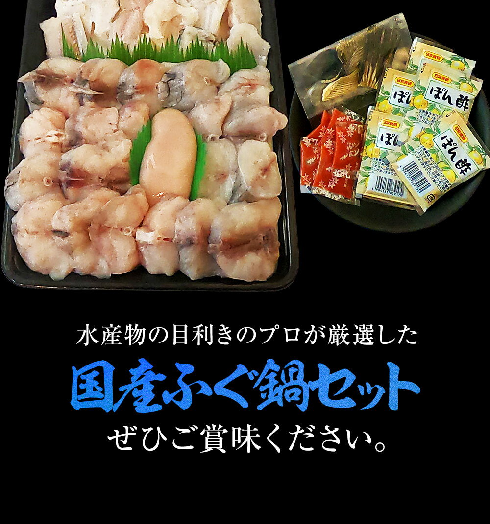 水産問屋のプライドにかけて本物の味を追求します! お歳暮、忘年会、新年会はこれに決まり!! 【商品名】 国産ふぐ鍋セット 【内容量】 内容量 とらふぐアラ200g、※天然ふぐ上身600、天然フグ白子(50〜60g)、乾燥ふぐヒレ1尾分、ポン酢、もみじおろし ※漁期によって天然真ふぐ、天然ごまふぐを使用しております。