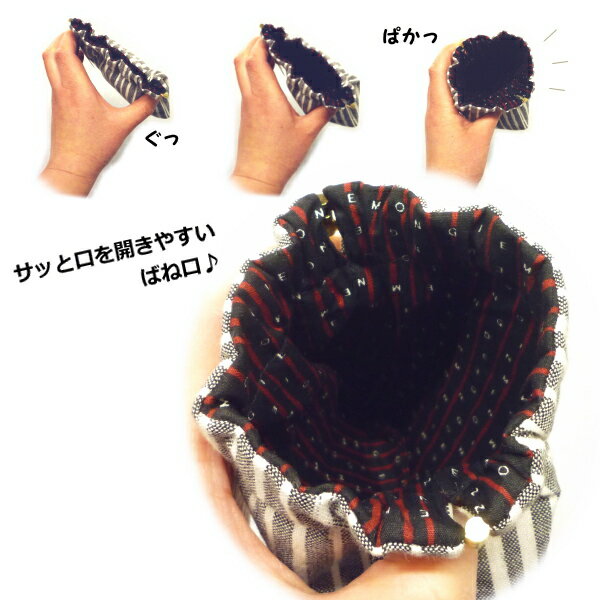 久留米絣が素敵なポーチ、 片手でサッと開け閉めできるばね口です。